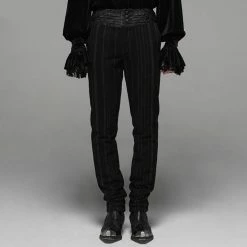 Pantalon noble au style gothique victorien de Punk Rave. Le pantalon Vulkan est fait d’un mĂ©lange de laine douce avec un motif marron rayĂ©. La ceinture est en brocart doux avec un motif paisley dĂ©taillĂ©.